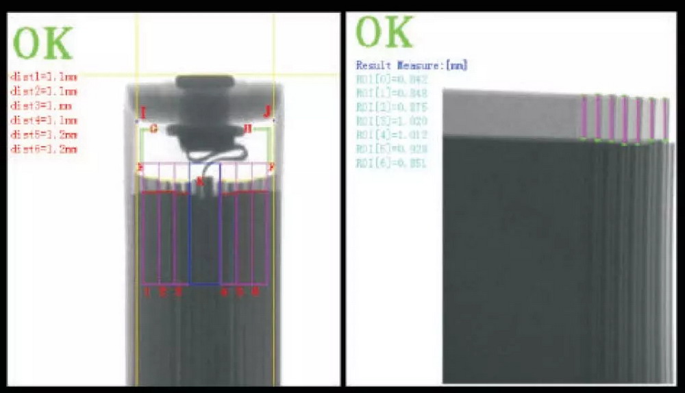 ▲铝壳电池头部极耳内部结构和正负极片对齐度检测
