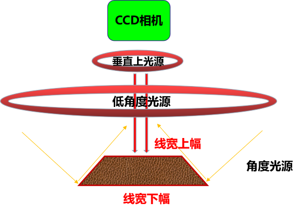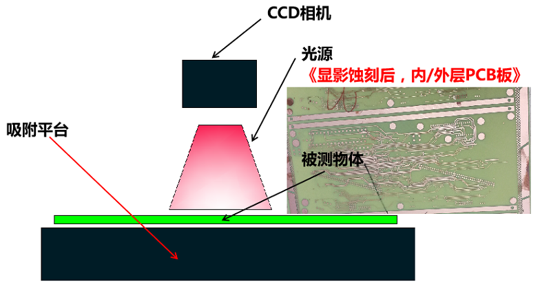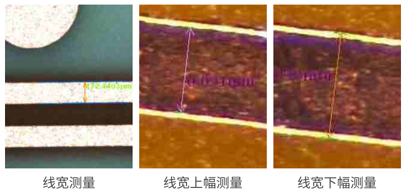 通过影像成像系统及光源从上表面垂直于被测板,呈显影像(相机实时拍图)感测,并将图像传送至电脑测量软件,通过软件测量工具分析图像的“线宽/线距/线宽上下幅/圆/金手指线宽等”标准公差值对比,从而判断被测板上的测量值OK或NG。