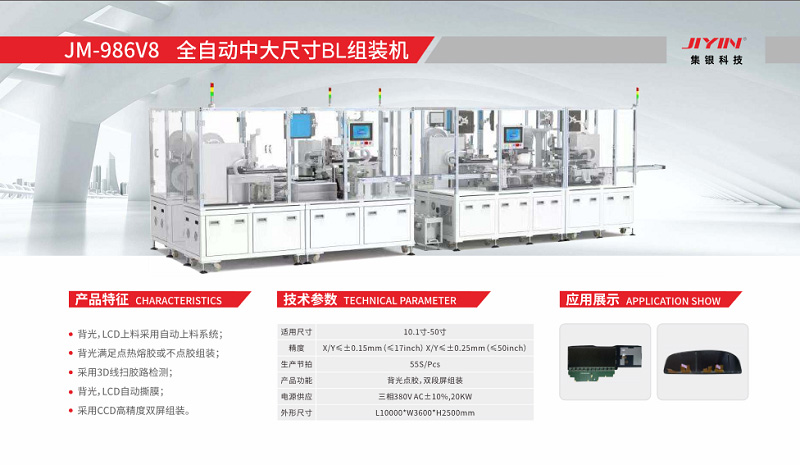 本次展会,集银科技带来了一系列平板显示智能装备解决方案亮相,包括:全自动小尺寸COF/COG绑定线、全自动中大尺寸COG绑定线、全自动小尺寸真空贴合线、全自动小尺寸OLED曲面贴合线、全自动背光组装线、全自动背光源组装线、非标自动化生产组装线。每一个智能装备解决方案都配有专属的展示大屏,从业者们纷纷驻足观看,并与现场工作人员密切交流。