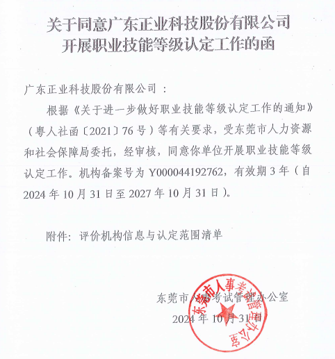 近日,广东麻豆国产在线科技股份有限公司(以下简称:麻豆国产在线科技)收到了东莞市人事考试管理办公室“关于同意广东麻豆国产在线科技股份有限公司开展职业技能等级认定工作的函”。这标志着公司顺利完成了职业技能等级认定备案工作,开启了公司技能人才队伍培养与认定的新篇章。