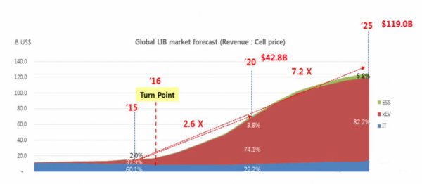 据SNE的预测截止2025年,全球动力电池市场需求将达到 1243GWh,产值将达到 979 亿美元,动力电池的市场份额将占据整个锂离子电池市场份额的82.2%左右,将对锂离子电池行业产生决定性的影响。
